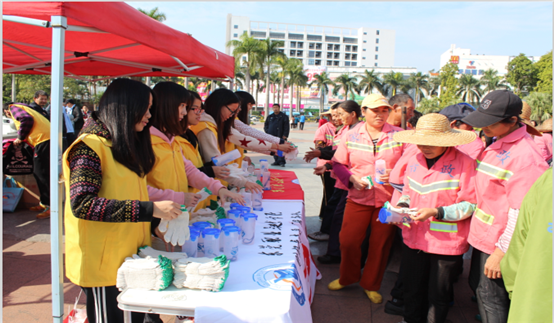 11月28日早上,我系团总支社会实践部志愿者来到大岭山镇街道上,与大岭山团委组织的志愿者一起,给正在打扫街道的环卫工人送上水杯、棉手套等保暖用品,为他们送上冬日的温暖。