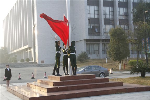 7点20分,精神饱满的师生们已经在晨光中面向国旗台列队集合完毕,等候升旗仪式的开始。30分,主持人宣布仪式正式开始,全体肃立,国旗护卫队队员迈着整齐的步伐,昂首挺胸走向国旗台。“升国旗,奏国歌,行注目礼”。全体师生面向国旗,行庄严的注目礼。伴随着庄严雄壮的《义勇军进行曲》,鲜艳的五星红旗在东职院上空冉冉升起,迎风飘扬。