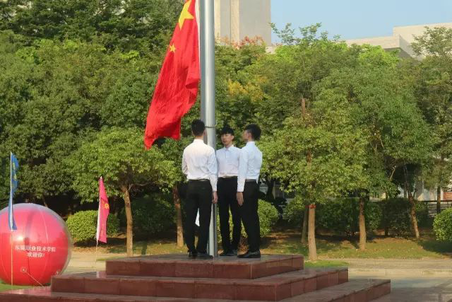 伴随着激昂雄壮的《义勇军进行曲》,鲜艳的五星红旗在初升的阳光映照下冉冉升起,迎风飘扬在东职的上空,全体师生肃立注目。